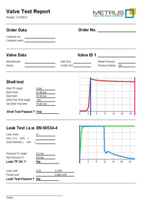 Leakage calculation and testing are performed according to EN60534-4 and EN12266 with high measurement accuracy using the proprietary METRUS analog-digital converter (PC box). Separate testing of the housing, seat leakage, and set pressure for safety valves is possible. During safety valve testing, individual distinctions can be made between leakage point, pop pressure, opening pressure, and closing pressure.