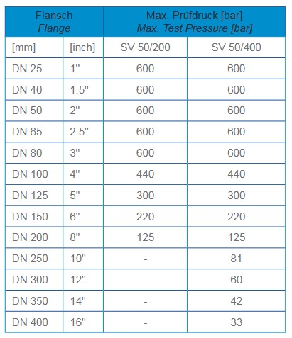 The SV 50/400 test bench is suitable for testing and setting of safety valves with valve sizes ranging from DN 10 to DN 400. The test valve is clamped with up to three adjustable clamping claws (depending on the flange size) or using the top beam in the clamping unit. The available test media are ND air (up to a maximum of 10 bar), nitrogen (up to 300 bar), and HP water (up to 600 bar).